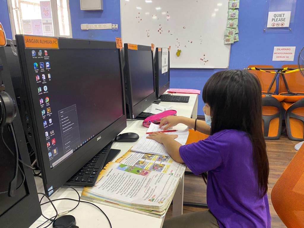Adik Nelyenn sedang mengikuti kelas ICT dan mendengar taklimat Advokasi.